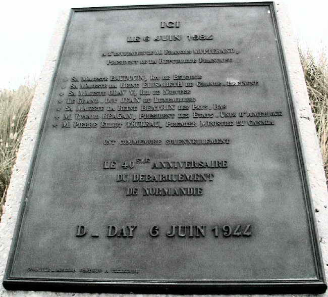|  President Mitterand and others placed this bronze tablet here on June 6, 1984 Inscription reads: "IN SOLEMN COMMEMORATION OF THE 40TH ANNIVERSARY OF THE DEBARKMENT AT NORMANDY"
