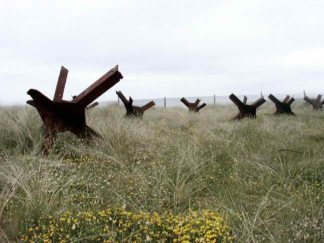 By The Hundreds these hedgehogs made of steel beams were intended to thwart landing ships. Once they lined the shores of Normandy in multiple rows. Today these few examples remain