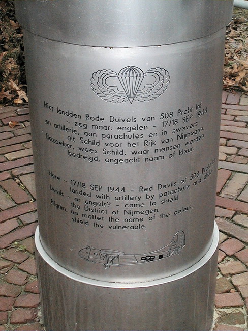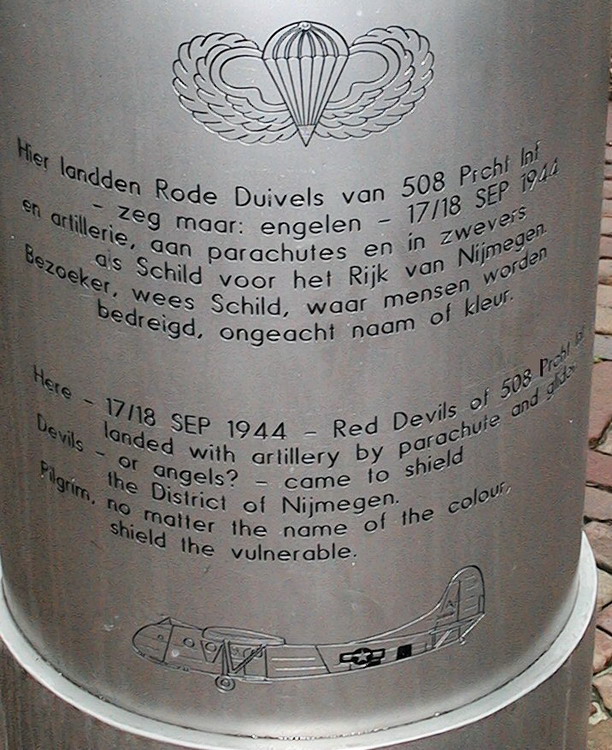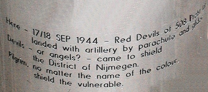 "Here - 17/18 Sept 44 - Red Devils of the 508 Prcht Inf landed with artillery by parachute and glider. Devils - or angels? - came to shield the District of Nijmegen. Pilgrim, no matter the name or the colour, shield the vulnerable." |