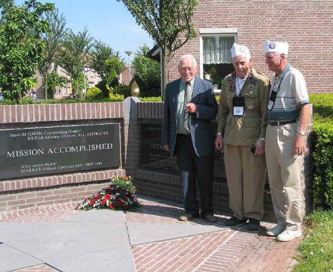 Tour Members (l-r) tour guide, Ernie Lamson, Herman Schoolcraft(Photo courtesy Ellen Peters) | "Mission Accomplished" General Gavin's Monument, located in Groesbeek, on Generaal Gavinstraat, a street named in his honor. The title is taken from an after action report written by Gavin himself. The monument was unveiled on June 12, 1994 by Mrs. J. E. Gavin. Her daughters and a grandchild were alt her side. Also in attendance were All American veterans and Dutch citizenry