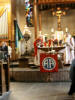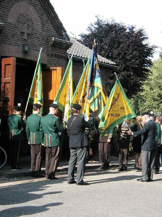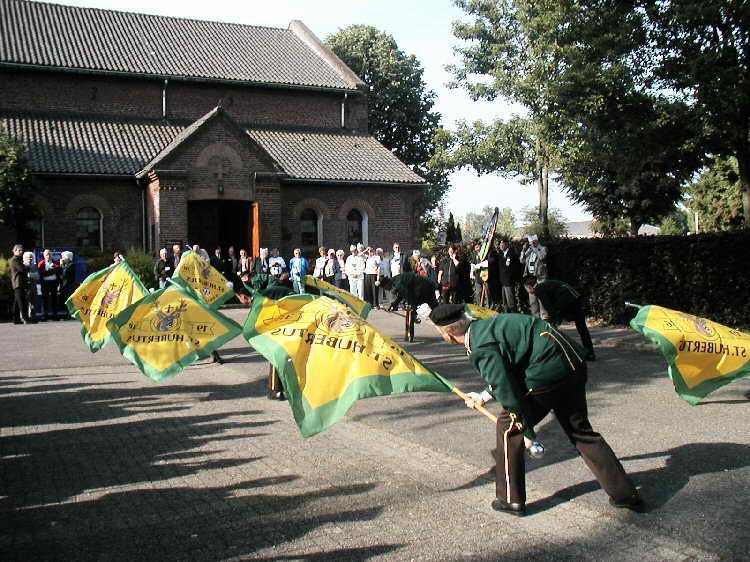 St. Anthony's Church The "Swinging Band of Brothers" performed before we entered the church |  Flag Choreography The Band's ability to twirl seemingly cumbersome flags in unison was a delight to watch |  St. Hubertus Origins The group dates back to pre-war 1936 |  Honors Accorded The Band formed an arch of flags for the attendees to file between |