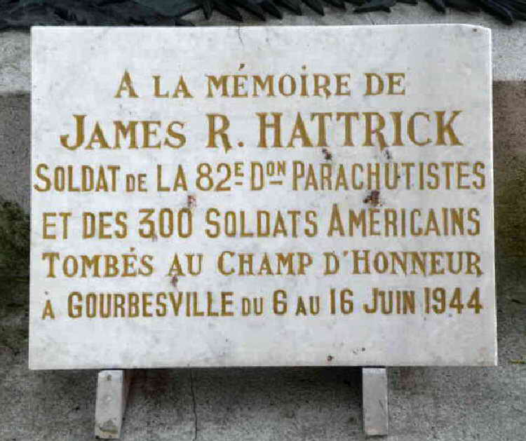 memorial plaque in Gourbesville honoring Hattrick and R.B.