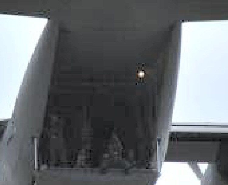 crewmembers, one casually sitting on the edge of the lowered ramp,