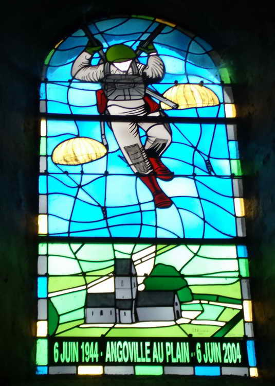 Paratroopers drop with church in background, 6 June 1944