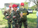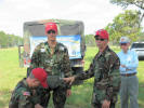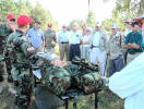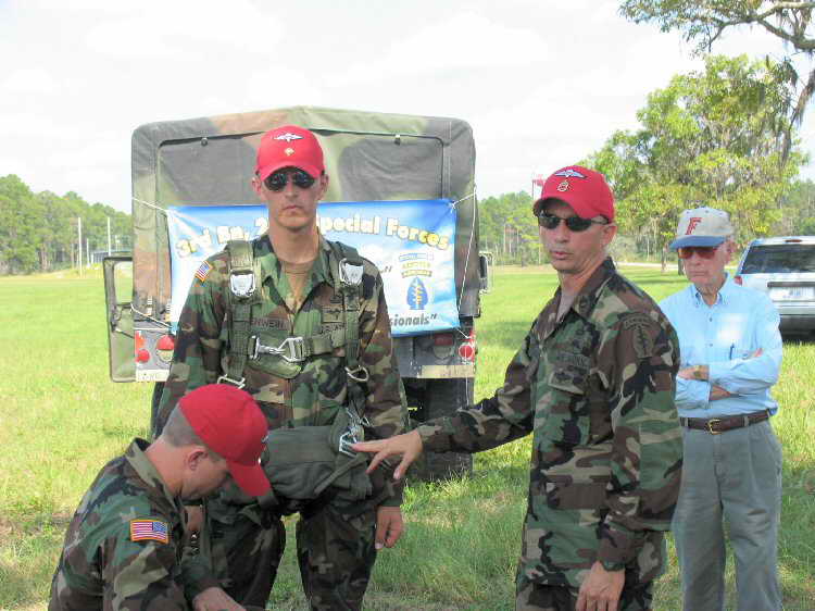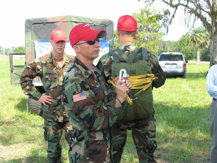 Red Hat Trainer points out some features of the modern day parachutist equipment (photo courtesy Ellen Peters)