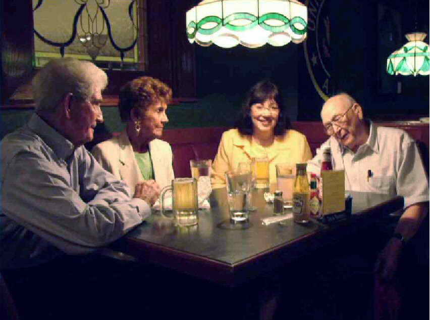 |  (l-r) Dinner at Hangar 49, the hotel restaurant finds Walter and Gloria Barrett and Ellen Peters listen to Zig Boroughs recounting a tale. (photo courtesy Graham Lawson)