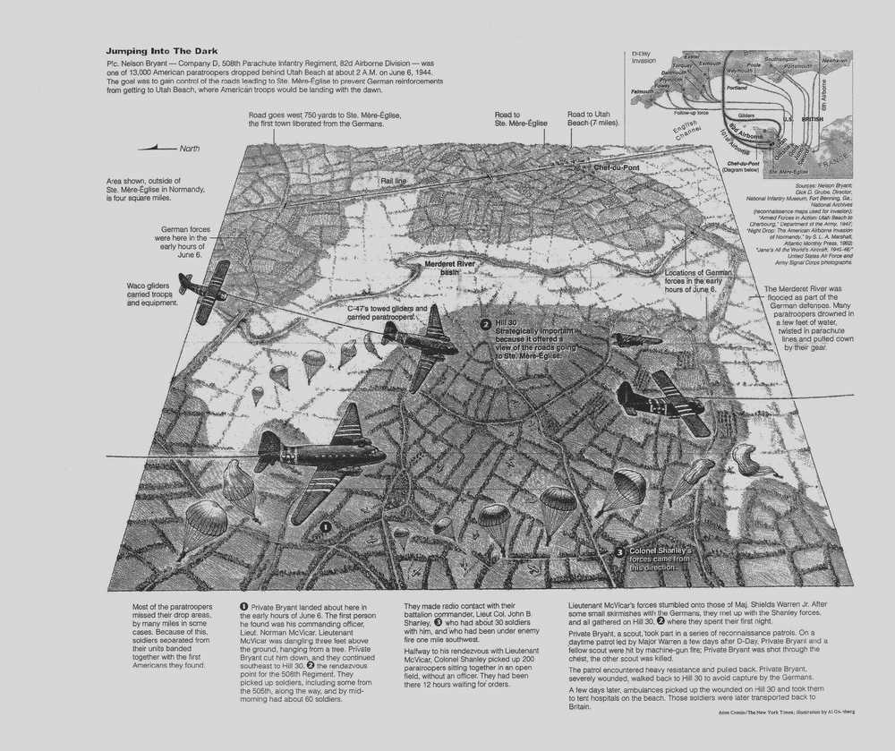 Published in the NY Times on June 5, 1994 this feature story was written by Nelson Brant who jumped into Normandy and Holland as a member of Company D,508th PIR. Although twice wounded, once by a machinegun round through the chest, Nelson survived the war and became a journalist. (Click on images below to read the story in a low resolution form or click on "high resolution" link near each photo for a larger image - approx 500 KB each, or, click here for a PDF version - approx 2 MB.) This is a story in his own words as to the effects that he felt after the war and his ultimate coming to grips with the experiences. |