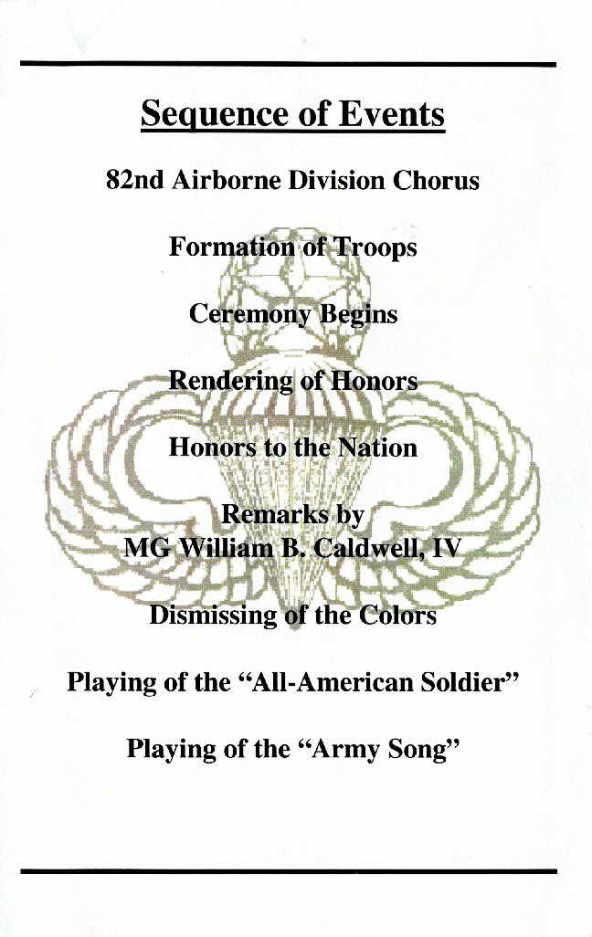 Sequence of Events included: - 82nd ABN Chorus - Formation of troops - Honors To The Nation - Remarks by MG Wm. B. Caldwell, IV |