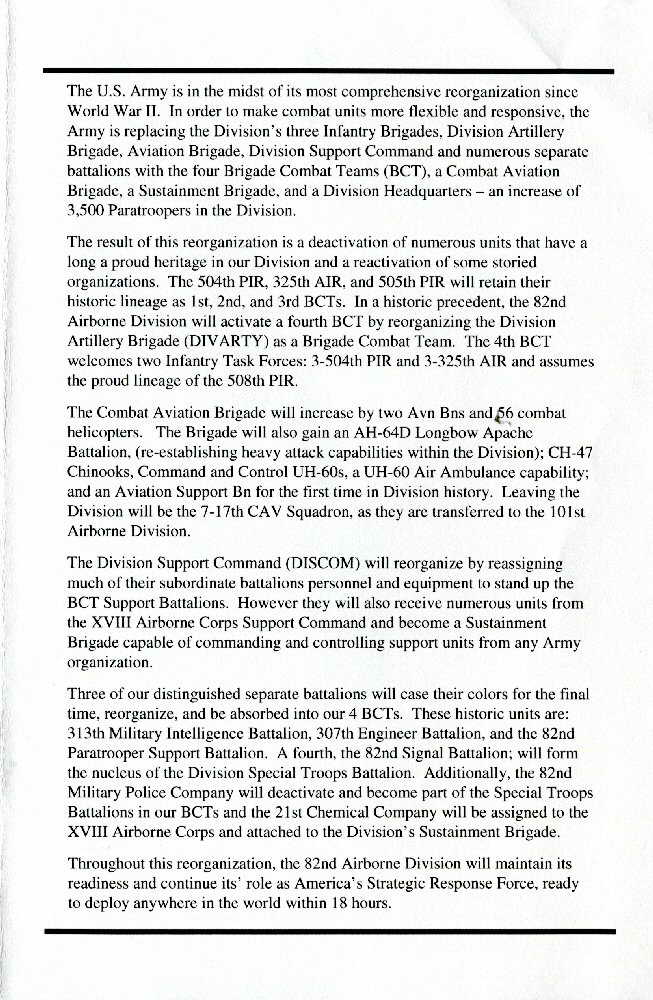 Explanation of The Airborne Reorganization explains the need to make combat units more flexible and responsive. The result is a reformation of the Division into four Brigade Combat Teams (BCTs). The 508th PIR has been infused with new blood by absorbing two other renowned regiments to form the 4th BCT. |