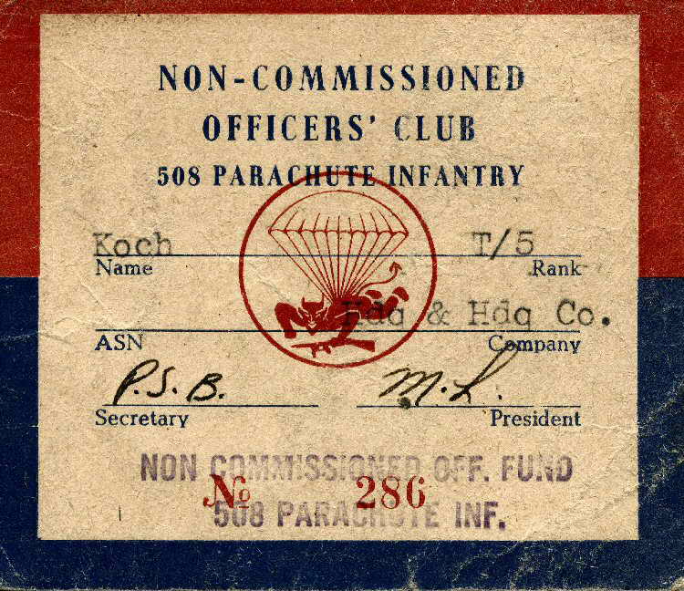 508th NCO CLUB Card As a Tec/5, Koch was entitled to membership in the Regimental NCO Club. He and other non-commissioned officers whiled away hours in the club enjoying drinks, perhaps playing cards or shooting darts and telling war stories. |