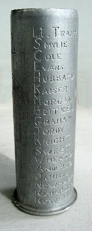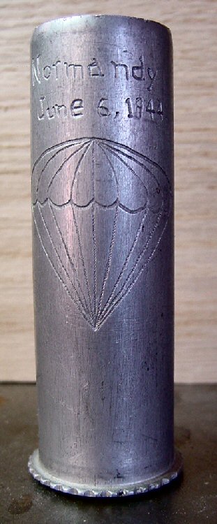 Normandy June 6, 1944 is written over the canopy of a chute | Names of one officer and 17 enlisted men are engraved to the right of the chute (see list below)