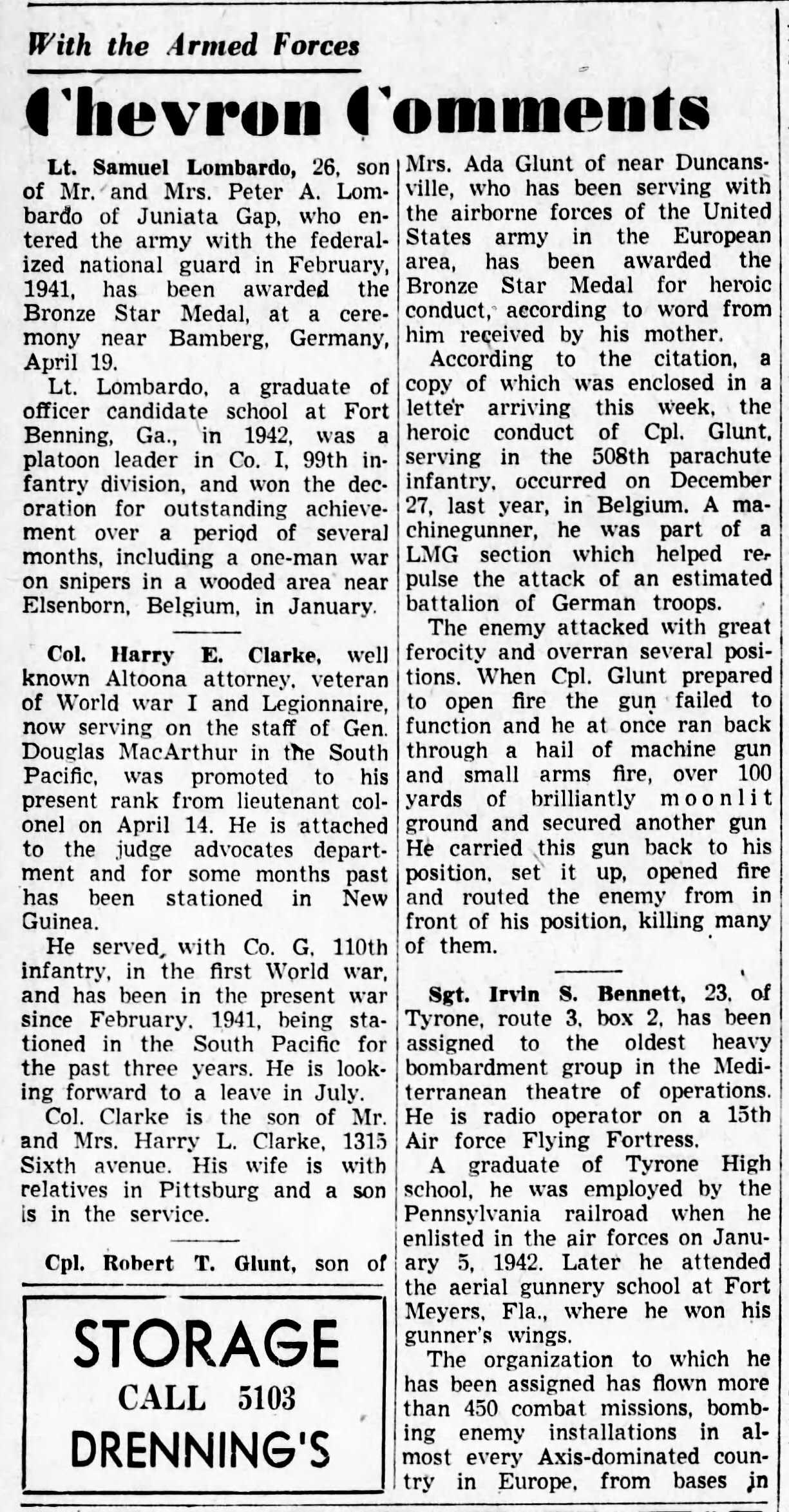 Cpl Robert T. Glunt, son of Mrs. Ada Glunt