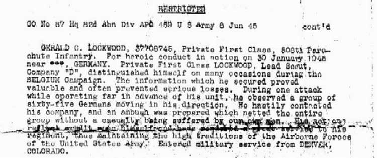 In General Order GO-87, Paragraph 2, dated 6 Jun 1945, Pfc. Gerald C. Lockwood (of Denver Colorado) was awarded the Bronze Star Medal for "heroic conduct in action on January 30, 1945 ... in Germany" when he was instrumental in setting up an ambush of 65 Germans who were killed or captured without any injuries to Lockwood's own unit.. |