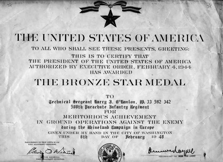 attesting to the award of the Bronze Star Medal To Technical Sergeant Harry