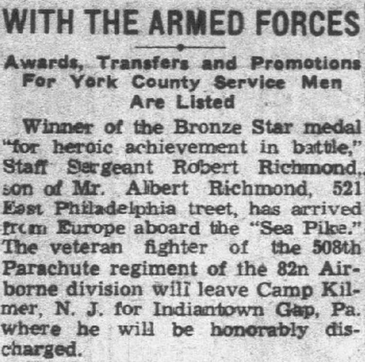 Sergeant Robert Richmond, son of Mr. Albert Richmond, 521 East Philadelphia