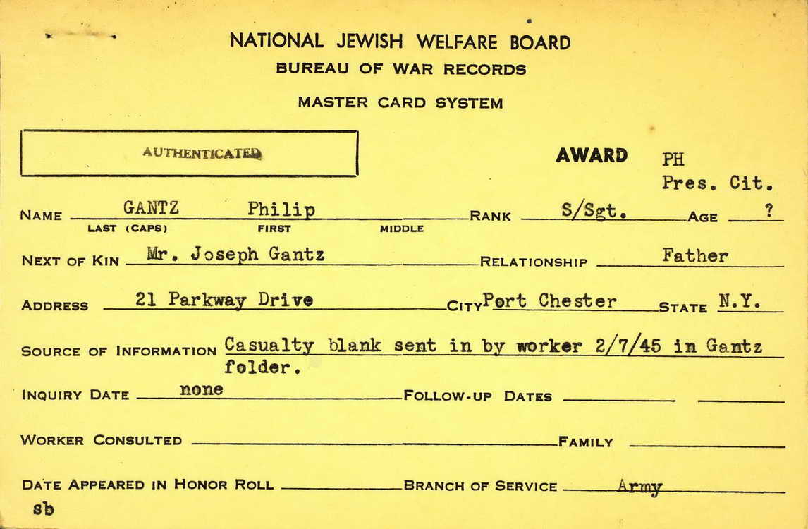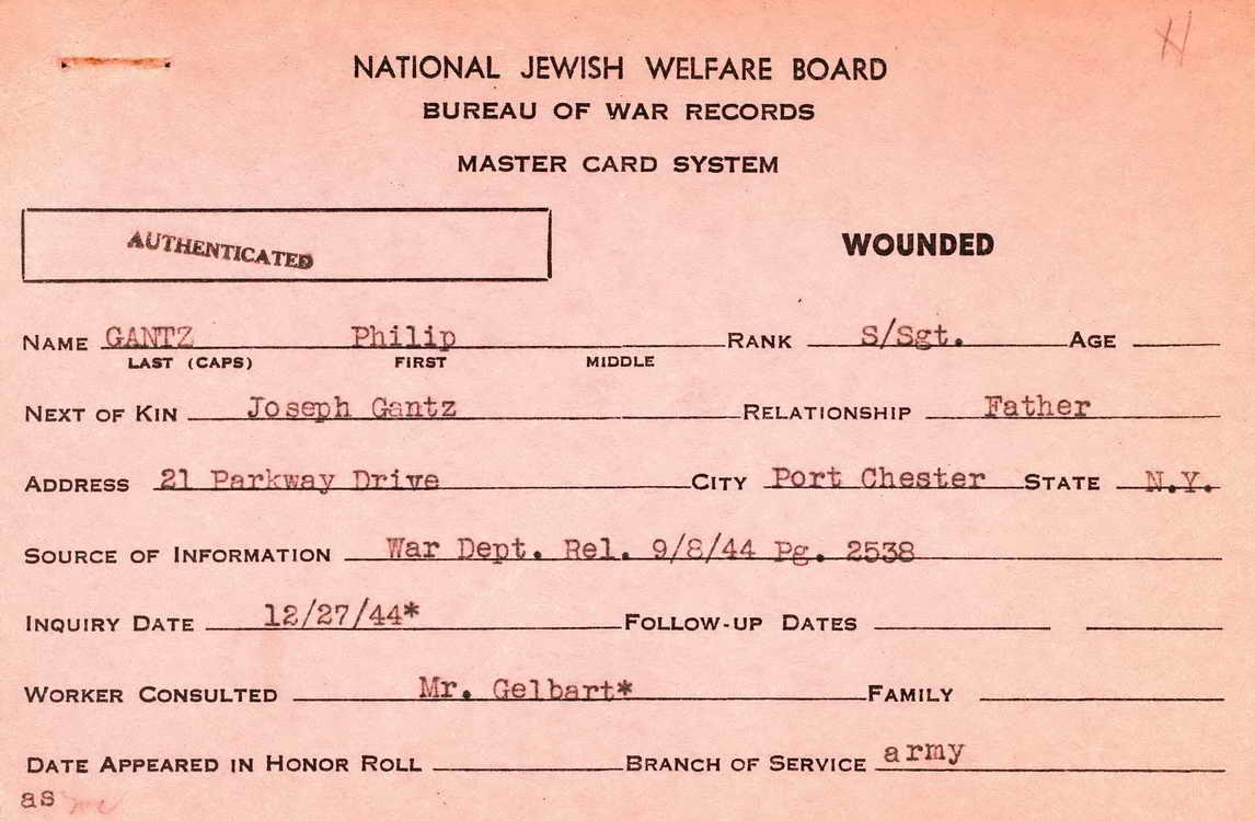National Jewish Welfare Board showing that he was reported as wounded in
