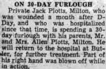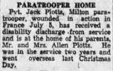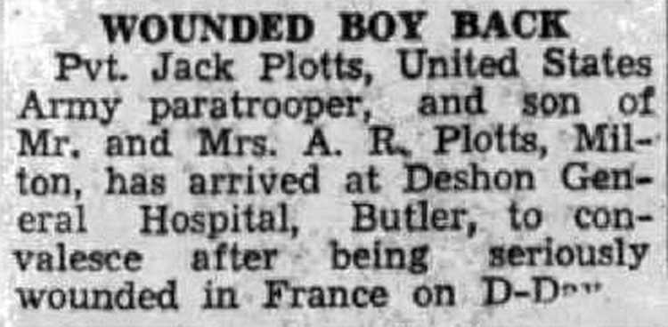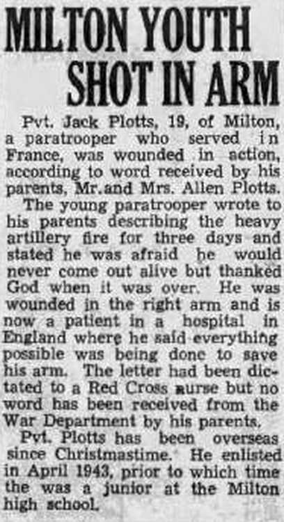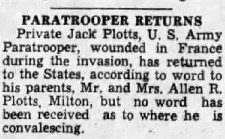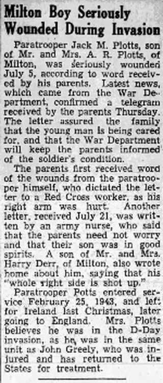 Paratrooper Jack M. Plotts, son of Mr. and Mrs. A. R. Plotts, of Milton, was seriously wounded July 5, according to word received by his parents. Latest news, which came from the War Department, confirmed a telegram received by the parents Thursday. The letter assured the family that the young man is being cared for, and that the War Department will keep the parents informed of the soldier's condition. The parents first received word of the wounds from the paratrooper himself, who dictated the letter to a Red Cross worker, as his right arm was hurt. Another letter, received July 21, was written by an army nurse, who said that the parents need not worry and that their son was in good spirits. A son of Mr. and Mrs. Harry Derr, of Milton, also wrote home about him, saying that his "whole right side is shot up." Paratrooper Potts [sic] entered service February 25, 1943, and left for Ireland last Christmas, later going to England. Mrs. Plotts believes he was in the D-Day invasion, as he, was in the same unit as John Greely, who was injured and has returned to the States for treatment.