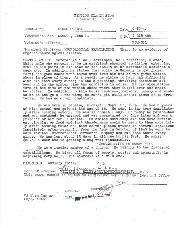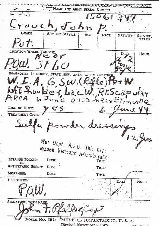 Pvt John P. Crouch was wounded on D-Day shortly after landing