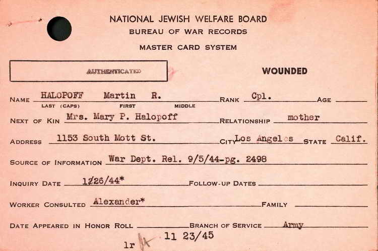 wounding of Cpl Martin R. Halopoff as provided to his mother Mary of Los