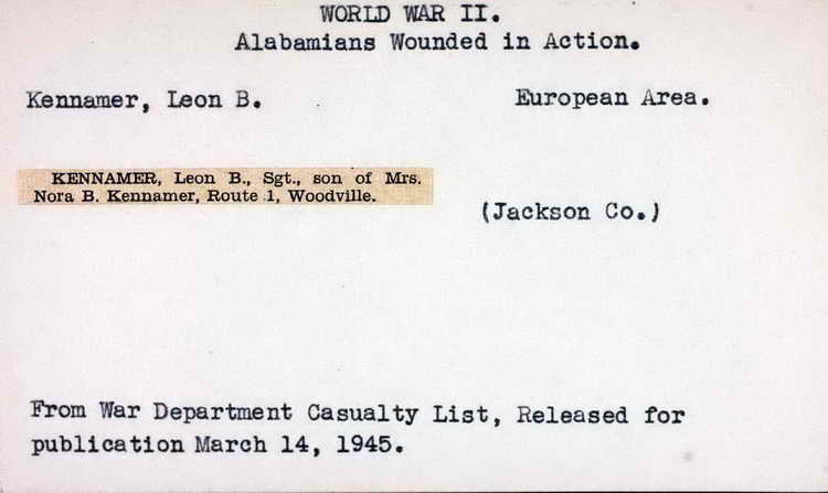 Sgt Leon B. Kennamer was listed by an Alabama records group as having been wounded in the ETO but the actual date of the wound is not shown. The information was extracted from a War Department Casualty List released on14 March 1945.