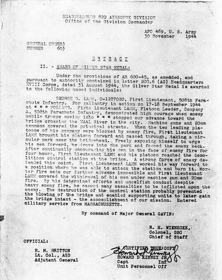 on 17-18 September 1944 at * * * HOLLAND. First Lieutenant LAMM, Platoon