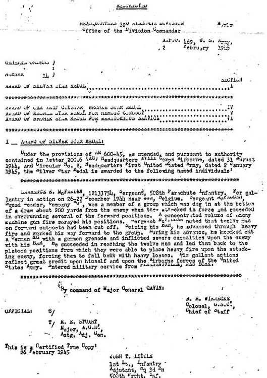 TO : Sergeant Lawrence E. McFadden, 12133754, Sergeant, 508th Parachute