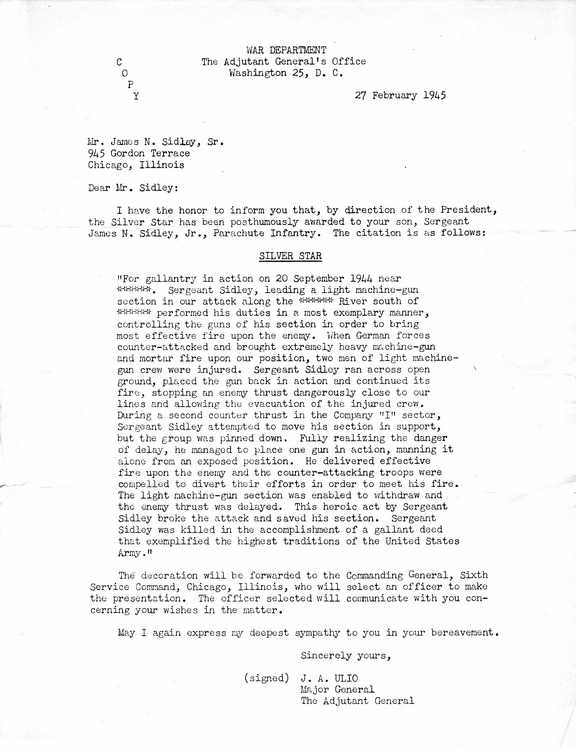 in action on 20 September 1944 near ****** Sergeant Sidley,