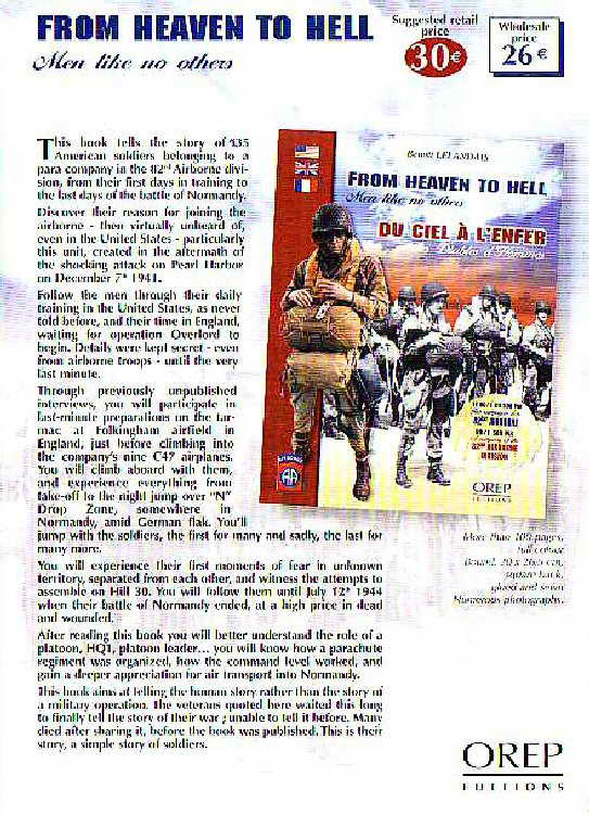 of the men of HQ 1st, 508th PIR from their days in basic training at Camp Blanding, through jump training in Ft. Benning and then the months of specialized training at Camp Mackall before they shipped overseas. Follow them through their wait i England as they prepared for Operation Overlord and then their final hours at Folkingham Airfield before nine C-47s carried them across the channel and their jump into Normandy on D-Day. Witness their struggle to assemble and the fight to hold Hill 30. Follow the remnants of the HQ1 Company as they returned to Nottingham with so few left after the Hell of more than a month on the battlefield This book may be purchased directly from the author by writing him at: Benoit Lelandais 143 rue Gambetta 50110 Tourlaville France. Enclose an Postal International Money Order, available at most Post Offices, for $48.50 dollars US. Price includes shipping. Be sure to provide your own postal address for shipment of the book. |
