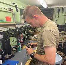 Left: SPC James, J/1-508, drills holes into a FLA for vehicle antenna installation.