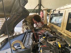 Right: SPC Palmer and SPC Wilder, J/1-508, troubleshoot a deadlined D/1-508 vehicle at the UMCP.