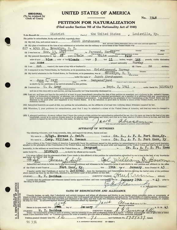 A.F.S. Fort Knox, Jacob submitted a Petition For Naturalization and took