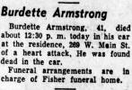 Burdette Armstrong, 41, died about 12:30 p. m. today in his car at the residence, 269 W. Main St. of a heart attack. He was found dead in the car. Funeral arrangements are in charge of Fisher funeral home.