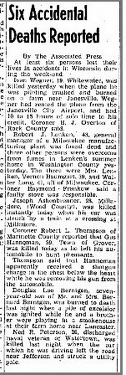 Joseph Ashenbrenner, 28, Milladore (Wood county), was killed instantly