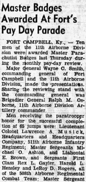 Men receiving the paratrooper honor for the successful completion of 65 jumps were: Lieutenant Colonel Lawrence A. Mustek, Headquarters and Headquarters Company, 511th Airborne Infantry Regiment; Master Sergeants Michael O. Ashton, and Liahontai E. Brown, and Sergeants First Class Rex L. Gayler, Harold L. Hensley and LeRoy D. Rogers, all of the 508th Airborne Regimental Combat Team;