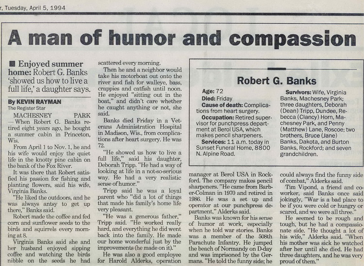 Banks, Machesney Park; three daughters, Deborah (Dean) Tripp, Dundee; Rebecca