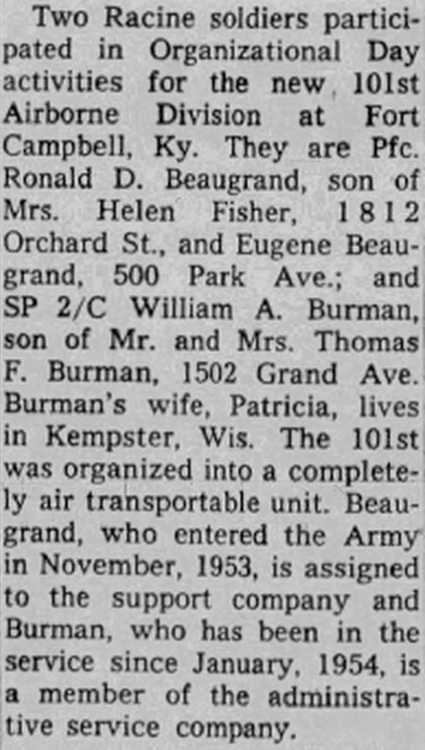 St., and Eugene Beau- grand, 500 Park Ave.; and SP 2C William A. Burman, son of Mr. and Mrs. Thomas Burman's wife, Patricia, lives in