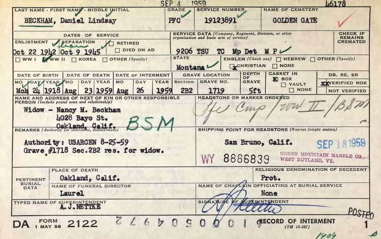 grave marker for for Daniel L. Beckham in Section 2B, Site 1719 of the