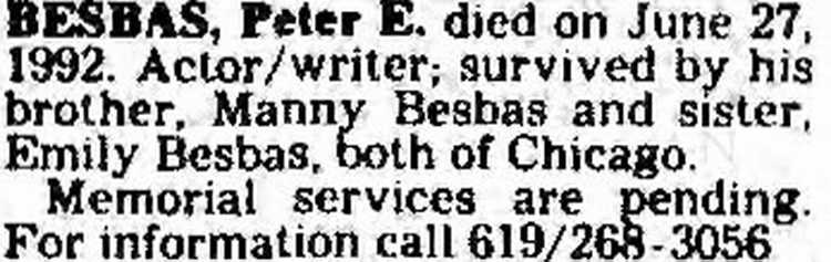 BESBAS. Peter E. died on June 27. 1992. Actor writer; survived by his brother, Manny Besbas and sister, Emily Besbas, both of Chicago. Memorial services are
