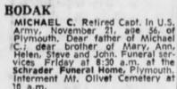 MICHAEL C. Retired Capt.. In U S. Army, November 21, age 54, of Plymouth. Dear father of Michael 'C; dear brother of Mary, Ann, Helen, Steve and John. Funeral services Friday at 1-30 a.m. at the Schroder Funeral Home, Plymouth. Interment Mt. Olivet Cemetery it 10 a.m.