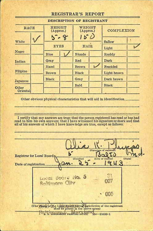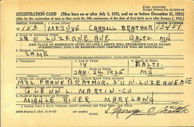 Mervyn registered for the draft with Local Board No. 5, Baltimore