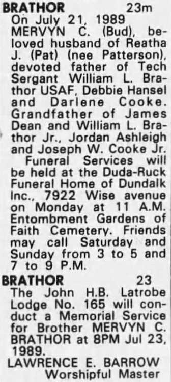 On July 21. 1989 MERVYN C. (Bud), beloved husband of Reatha J. (Pat)
