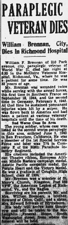 William T Brennan of 210 Park avenue, city, paraplegic veteran of