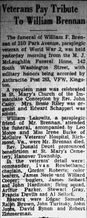 The funeral of William F, Brennan of 210 Park Avenue, paraplegic