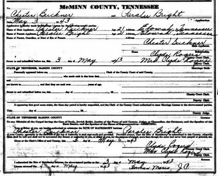 3 May 1943, Chester married Paralee Bright in McMinn county,