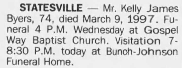 STATESVILLE — Mr. Kelly James Byers, 74, died March 9 1997. Funeral 4 PM Wednesday at Gospel Way Baptist Church. Visitation 7-8:30 PM today at