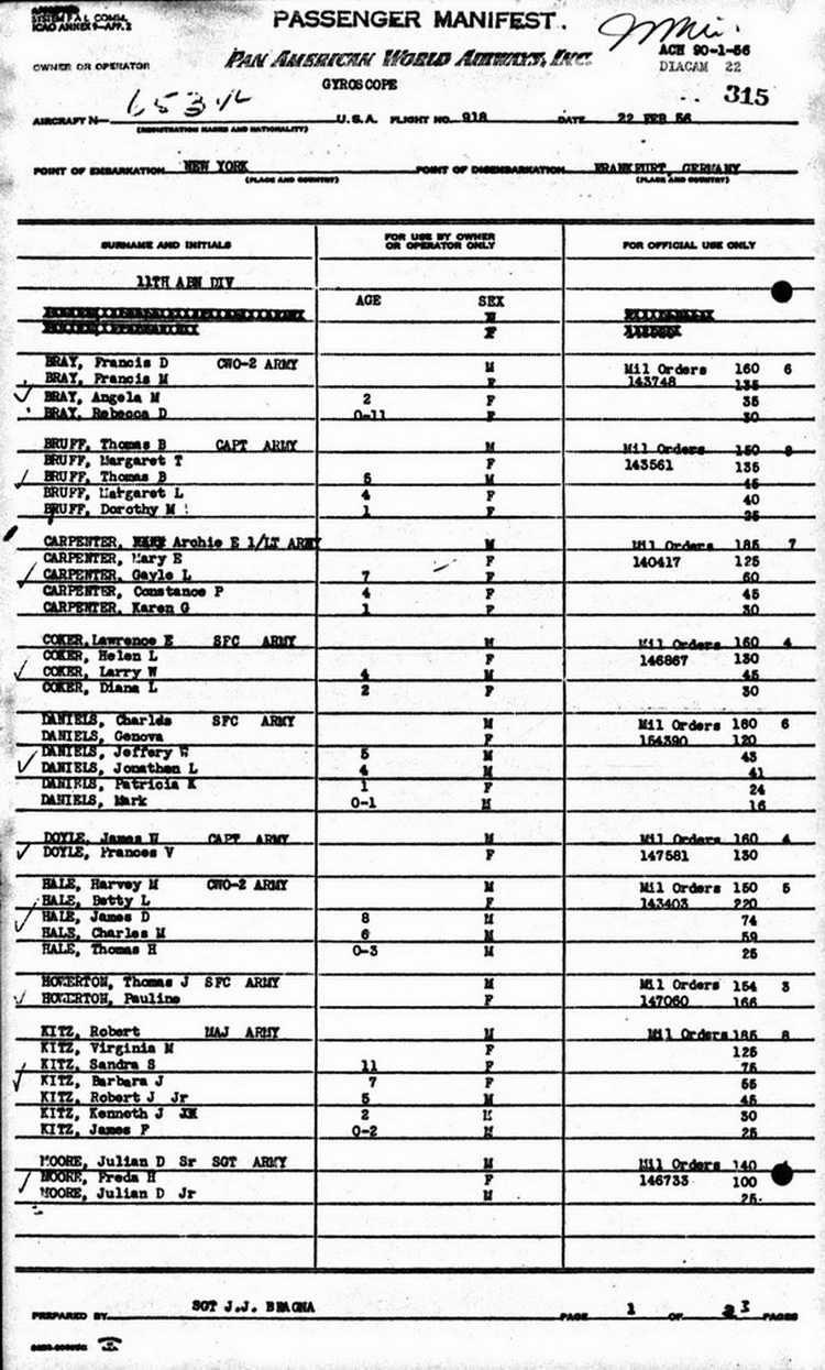 22 February 1956, 1st Lt Carpenter departed Idlewild airport, New York, NY