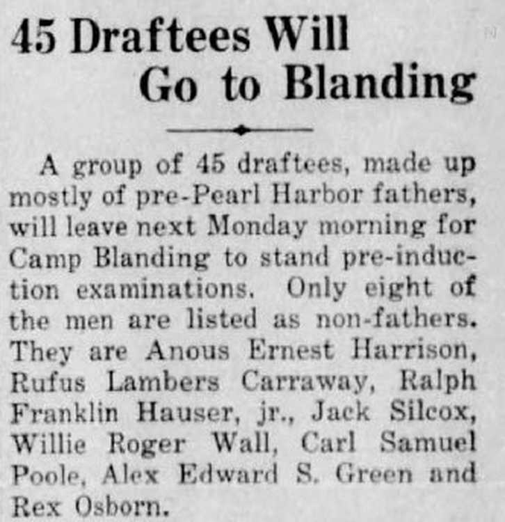 A group of 45 draftees, made up mostly of pre-Pearl Harbor fathers, will leave next Monday morning for Camp Blanding to stand pre-induction examinations. Only eight of the men are listed as non-fathers. They are Anous Ernest Harrison, Rufus Lambers Carraway