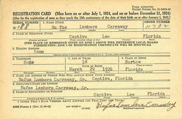 RUFUS LAMBERS CARRAWAY, JR. Rufus Lambers Carraway, Jr., 68, Arcadia, died Wednesday, February 8, 1995, in Arcadia. Born In Bartow, Fla., he was raised in Lee and Collier Counties.