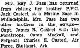 Mrs. Ray J. Pase has returned from visiting her brother P.F.C. Jack Casteel, at a Marine Base Philadelphia. Mrs. Pase has two other brothers in the.