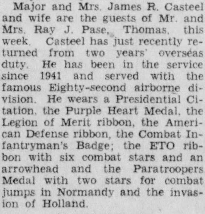 Mrs. Paul C. Fazenbaker, Westernport, received word her brother, James R. Casteel was promoted major, May 30. He